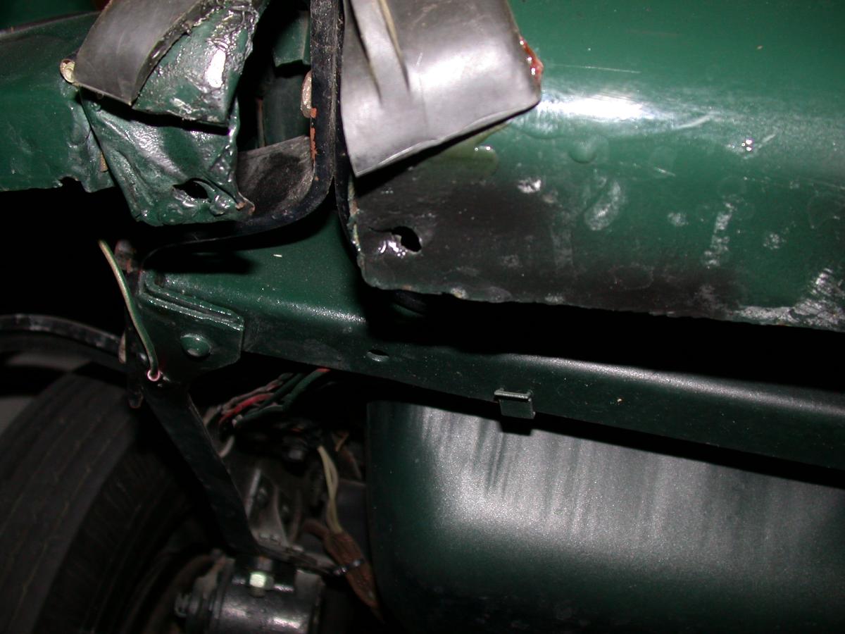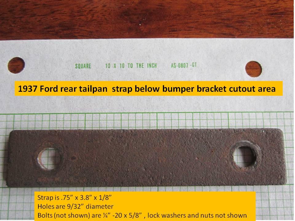 I believe this discussion is about the "strap" that straddles the rear body cut out made for clearance of the bumper bracket (I could be wrong). In any case, this strap reinforces the rear body cutout area. If the strap is missing I could envision the fender causing the body cutout area to pull apart, leading to cracking. In any case, attached is a pic of my 37 Fordor. Tomorrow I will remove this strap and take some measurements/pics. It looks quite easy to fabricate. gregg