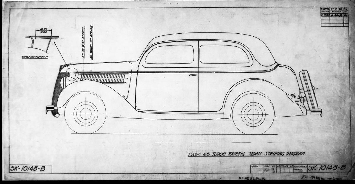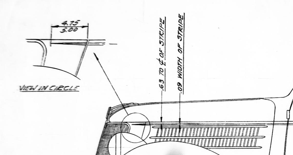 According the original 'SK' (assembly instruction drawings) the '36 pin stripe was 3/32" in width and commenced with a slight curve right behind the stainless steel molding at the opening of the grille in the upper corner and continued rearward and around the body 5/8" below the belt line. Original surviving examples and photos from Ford's archives suggest that in some instances the upward curve at the beginning of the striping on the grille side panels was left off and the stripe was a straight line at those points.