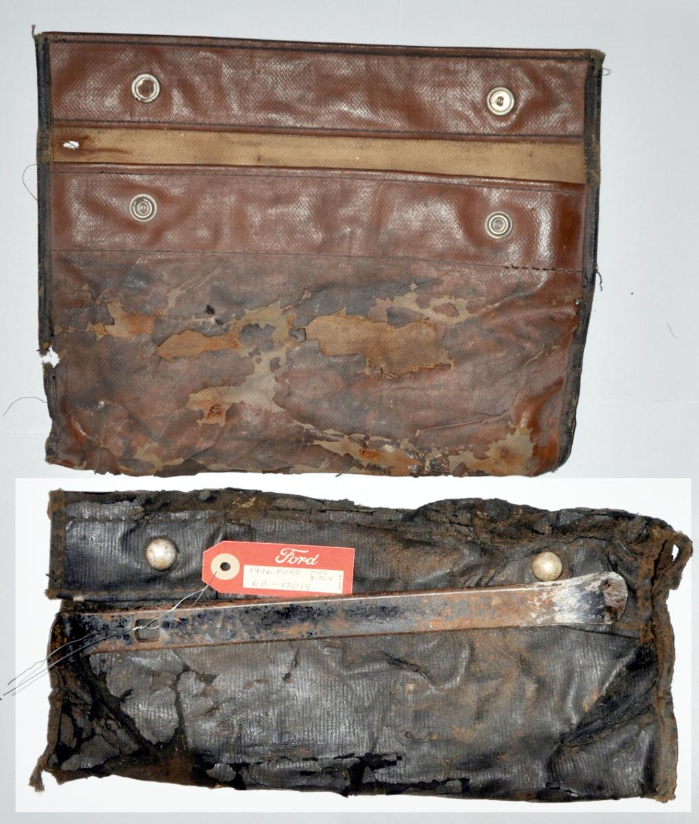 The brown tool pouch is known to be original to a 1939 V8 60 hp. The black pouch, I believe, is correct for some 1936 cars as it is long enough to fit the 12 inch tire iron. I have seen other original '36 pouches that are 11 inch, it may have been something due to a factory location or something.