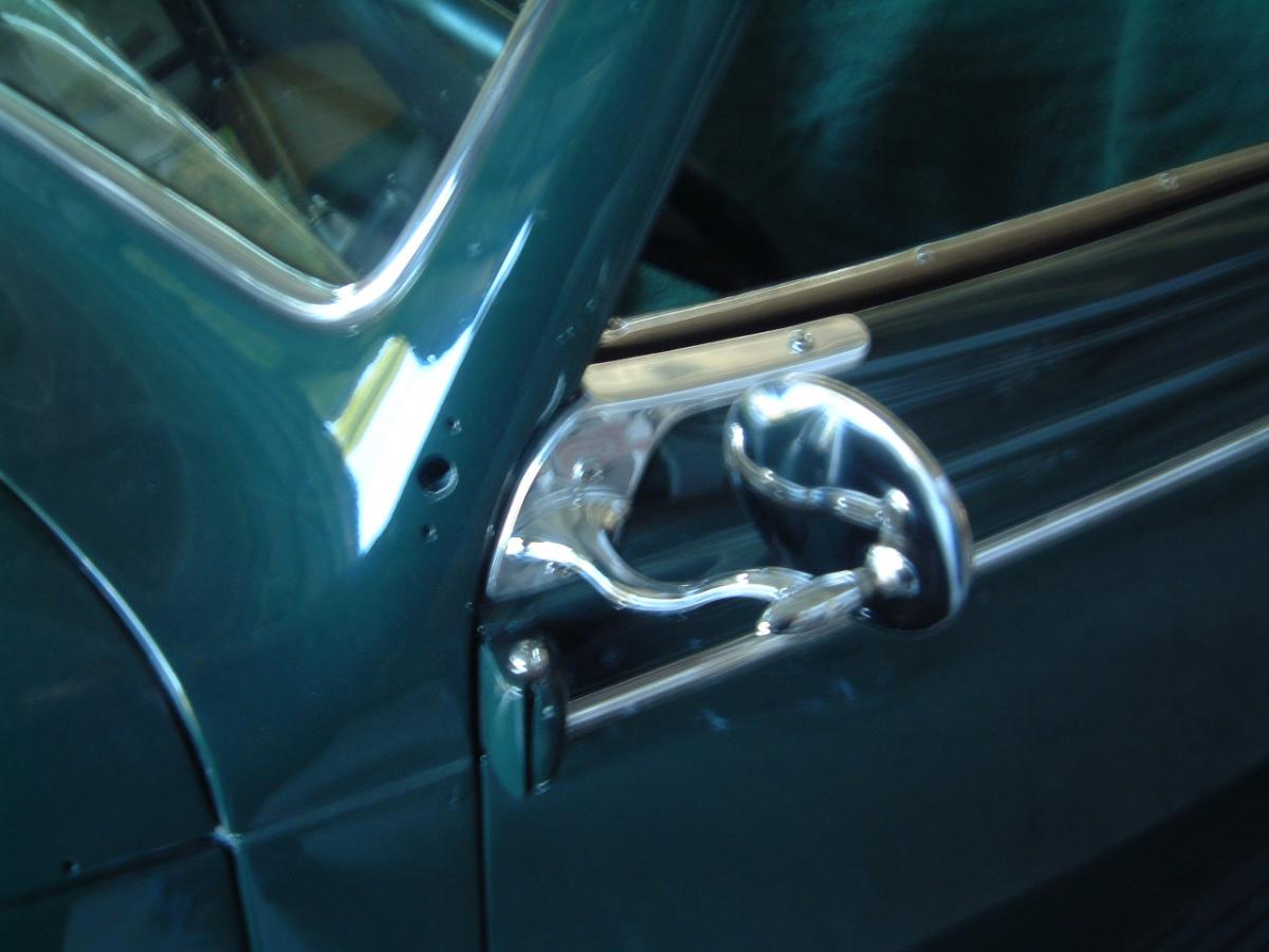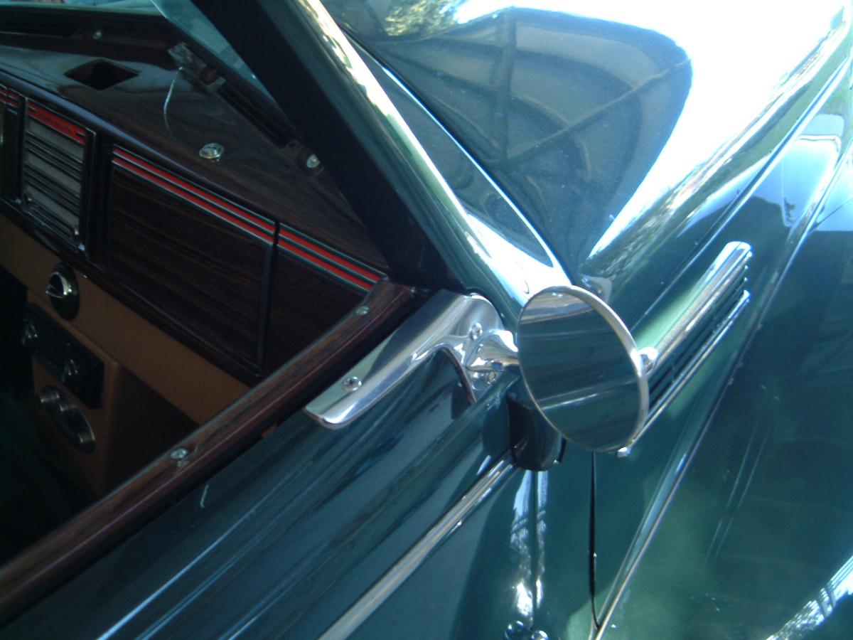 The '37-41 DPCD open cars, unlike the Fords, had factory applied wind wings that were attached to the outer door skin via 4 1/4- 20 bolts. I have a set of accessory wind wings that came with my '36 Ford coupe, I never did like the looks of them on my car so they have not been on the car since 1952. The wind wings on the '37-41 DPCD cars were very well made, heavy cast stanchions attached via 4 -1/4-20 bolts. I made a hardwood buck to form the sheet aluminum over. Attached the mirror's and bracket with similar DPCD counter-sunk bolts and rubber gasket. I use convex type mirrors, in a size large enough to cover the original mirror, which really improves the visibility on the right side.
