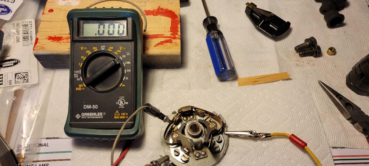 Tom, reassembled the distributor and re-attached to engine. With dwell meter on lead to distributor and other on ground, cranking the engine produces no measurement. Dwell meter is an older analog type but works well as I recently used it on my 1969 F100 pick up. I would think the lack of dwell measurement would coincide with a short on the breaker plate. Would you agree? Attached is a picture of the multimeter probe attachments to the breaker plate with ohm meter at max resistance. My understanding is that it should read 1. with good insulation. As you can see it is reading 0.000 which I interpret to indicate a short in the plate. Like to hear your thoughts. Thanks.