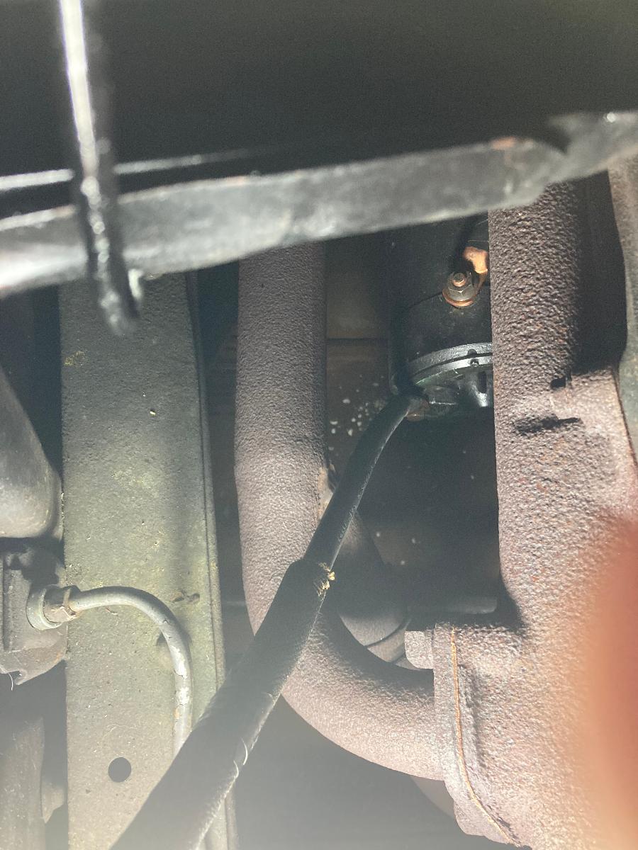 Do you have a cable connected to the top brass bolt on the starter? I cannot tell from the photo. Where is the other end of the cable connected to the mounting bolt connected? Normally the starter just has one cable coming from the solenoid to the brass bolt on top of the starter. The Grounding of the starter motor is accomplished through the mounting face of the starter.