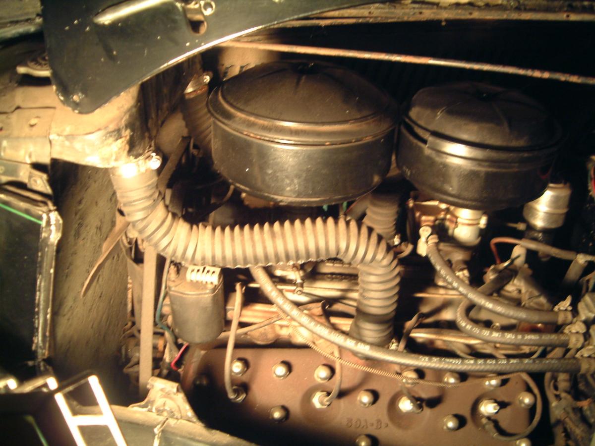For some unknown reason the second pix showing the side mount gen on my engine did not up load, I'll try again. Some place in my stash of EV8 info I have an article and picture of a '39 generator cut down for a fan mount on a wide spread dual carb manifold.. After I loaded the attached pix to this thread I opened the thread for a review, I noted that the side mount generator works very well on the 24 stud 59AB engine, however, the location of the hose down from the radiator to the front mounted inlet/pump will present a problem. An enlarged review of the attached pix will reveal the home made fan mount behind the side mounted generator. Bill 36 5 win delx cpe