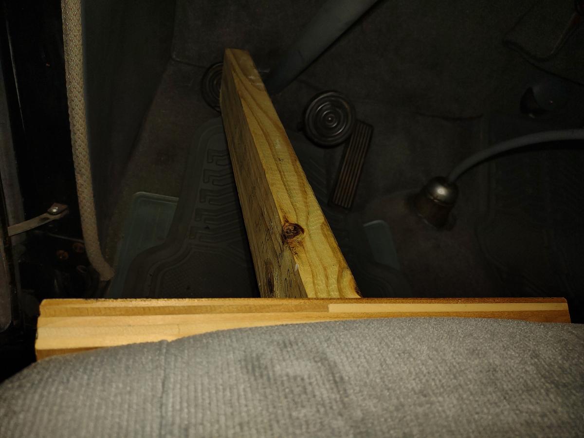 Zoopie36, the attached pic shows the clutch disengaged with a support against the front seat. This support was provided by the former owner. He explained if the car was going to be stored for any length of time this would keep the clutch disc off of the flywheel. As 40cpe explained this will keep the pressure off the disc. I use this support after every cruise since I never know when the next cruise will be.