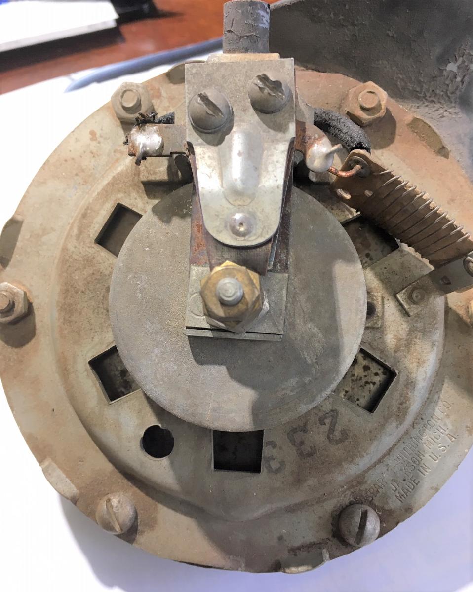 I don't know if the horns on a '46 are similar to the '38 horns or not, but here are pics of the '46 horns with the cover off. The nut and adjusting screw are just above the contact points.