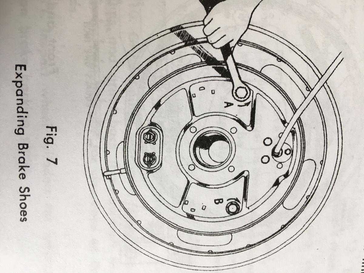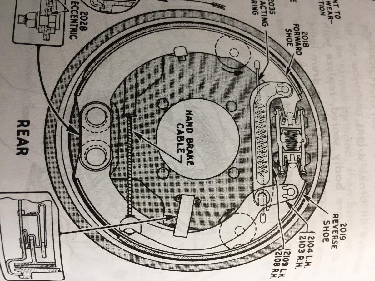 In reality these Lockheed style brakes basically stop with the leading edge shoe. When the brakes are pushed out, the leading shoe is pushed down in the gap at the bottom by the spinning drum. This automatically adjusts the leading shoe to make contact on the bottom edge while the cylinder pushes out the top edge. In reverse, the "leading edge" is the rear shoe.