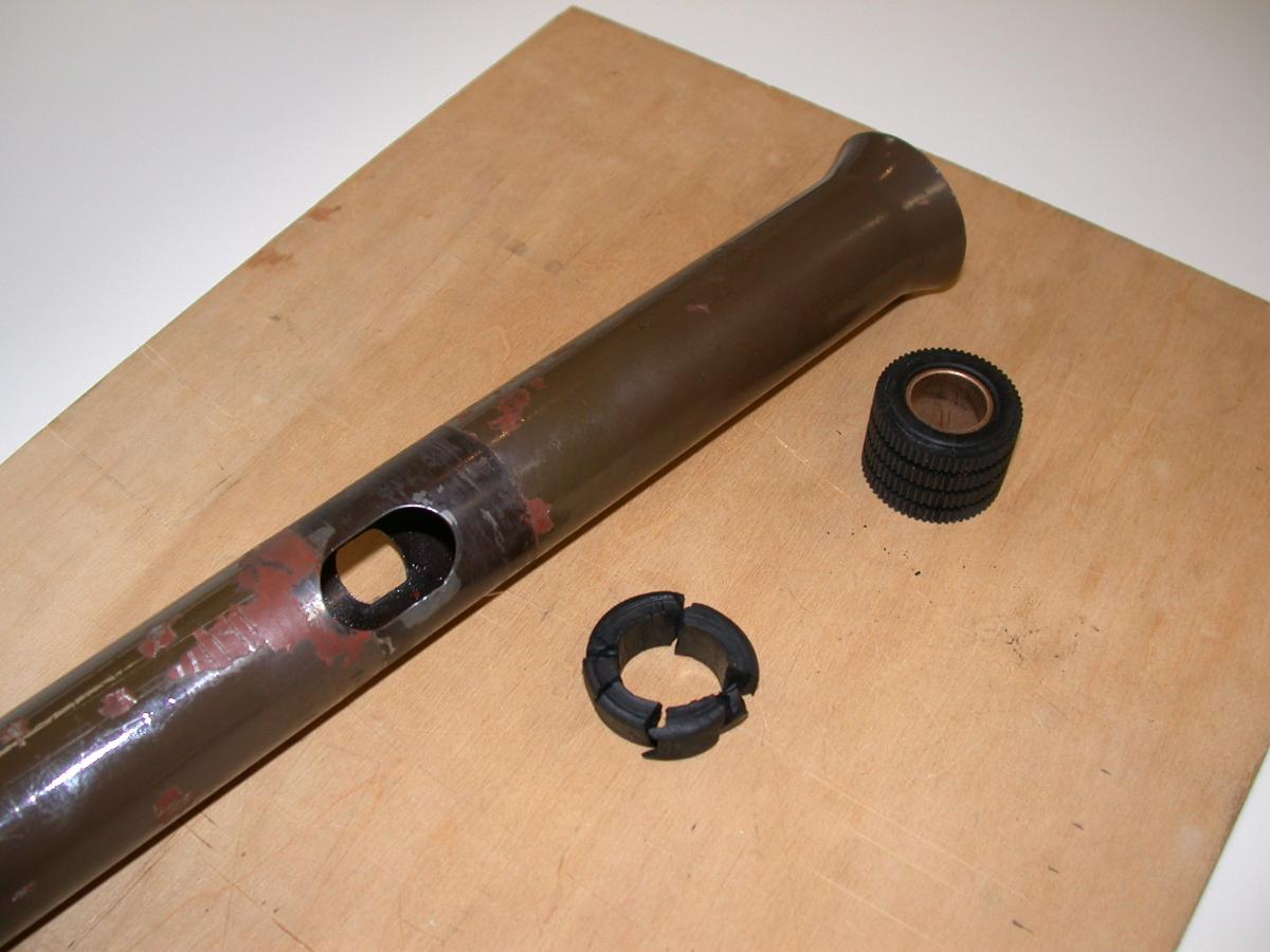 I am restoring my steering column in my 37 Phaeton and have the steering tube out. I pressed the upper bearing (40-3517-A) out and have a replacement as you see in the attached photo. Below the upper bearing, just next to the oblong hole in the tube, there was a plastic sleeve or grommet. When I attempted to press it out it crumbled and fell apart...see photo. From my parts book, this appears to be "steering shaft grommet", part number B-3533. Does anyone know where I can get a replacement? Does anyone know the purpose of this part?....it is not readily apparent to me the function of the grommet. It was located just above the oblong hole...is this the correct location?