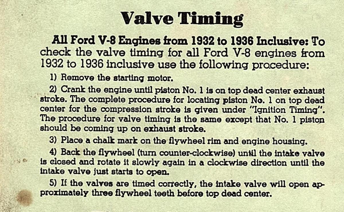 The text image is from the Ford Chassis Repair Manual for '32 -'36. I'd like to see what comments come from reading those instructions. My engine is set as shown in the gear picture -arguably correct, but not according to the text. Now it's just a challenge for me. Is it the notch, or is it the nick? I feel bad that I brought it up. I'm Brad, thanks for thinking about it.