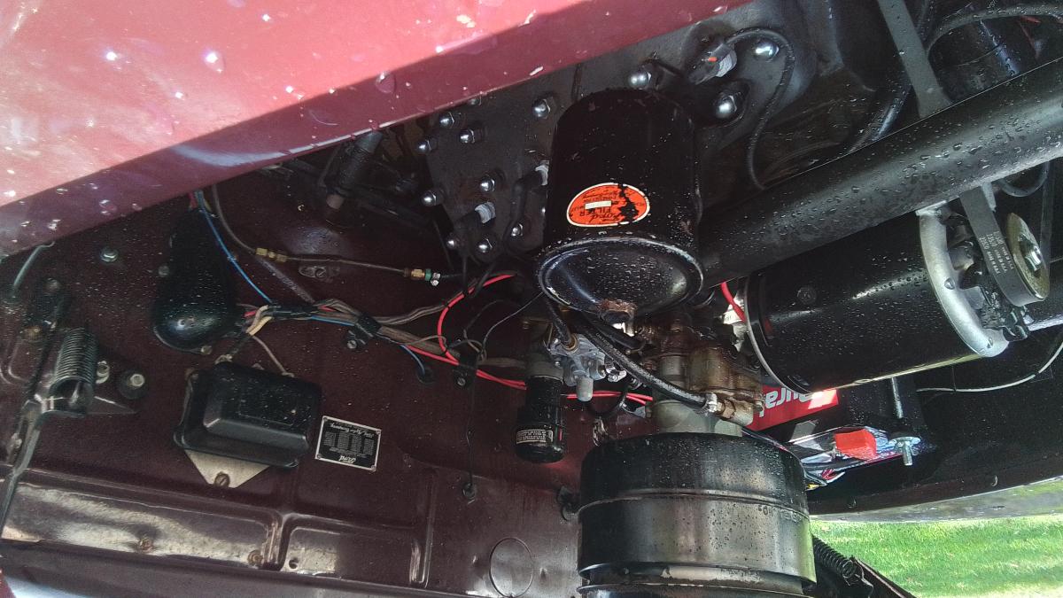 There is a rear seal, but they do have a tendency to seep a bit. The hole in the bottom of the housing allows oil to drain so the clutch doesn’t become soaked in oil. The cotter pin in the hole moves around and keeps the hole from getting plugged. Someone once said that old Fords are like dogs, and they like to mark their spots. I noticed you have a Powermaster alternator in place of the standard generator. I have a 6V + ground on my 59AB in my ‘46 Coupe and it works well. Your car looks good, and welcome to the EFV8 Club. For some reason, your pictures posted upside down.