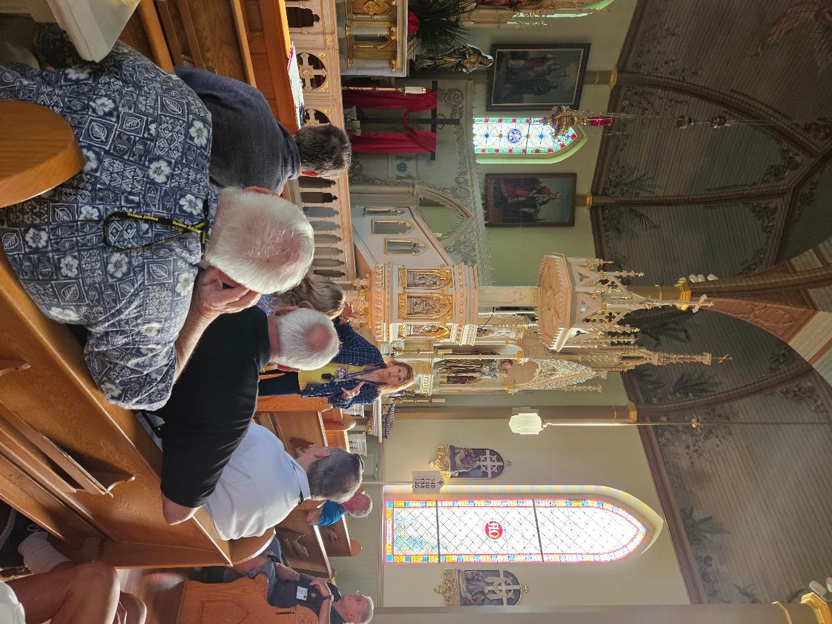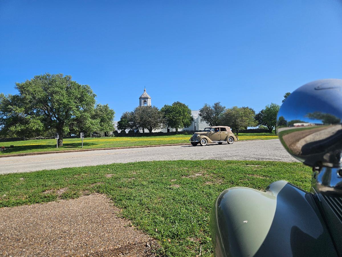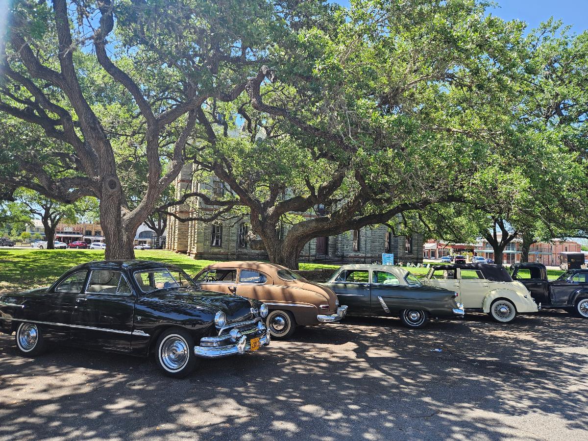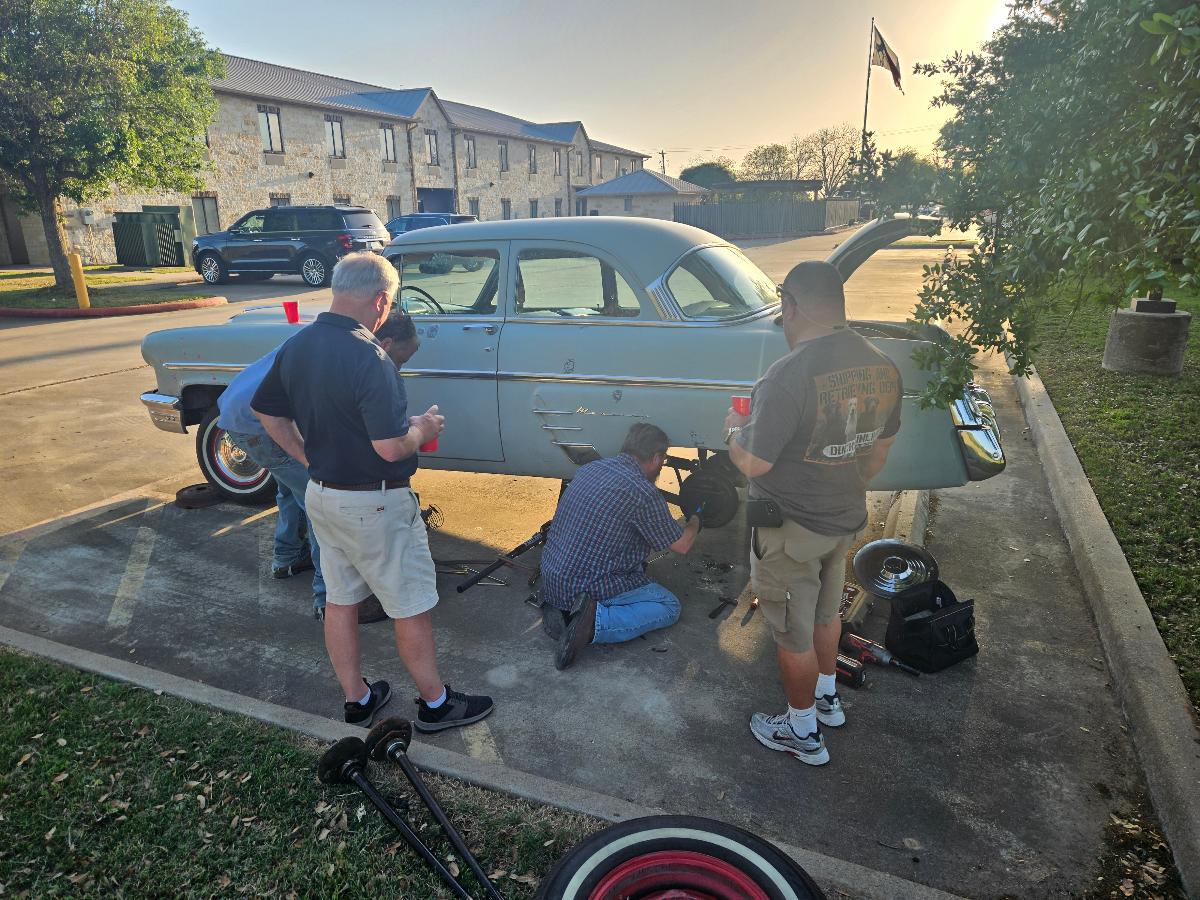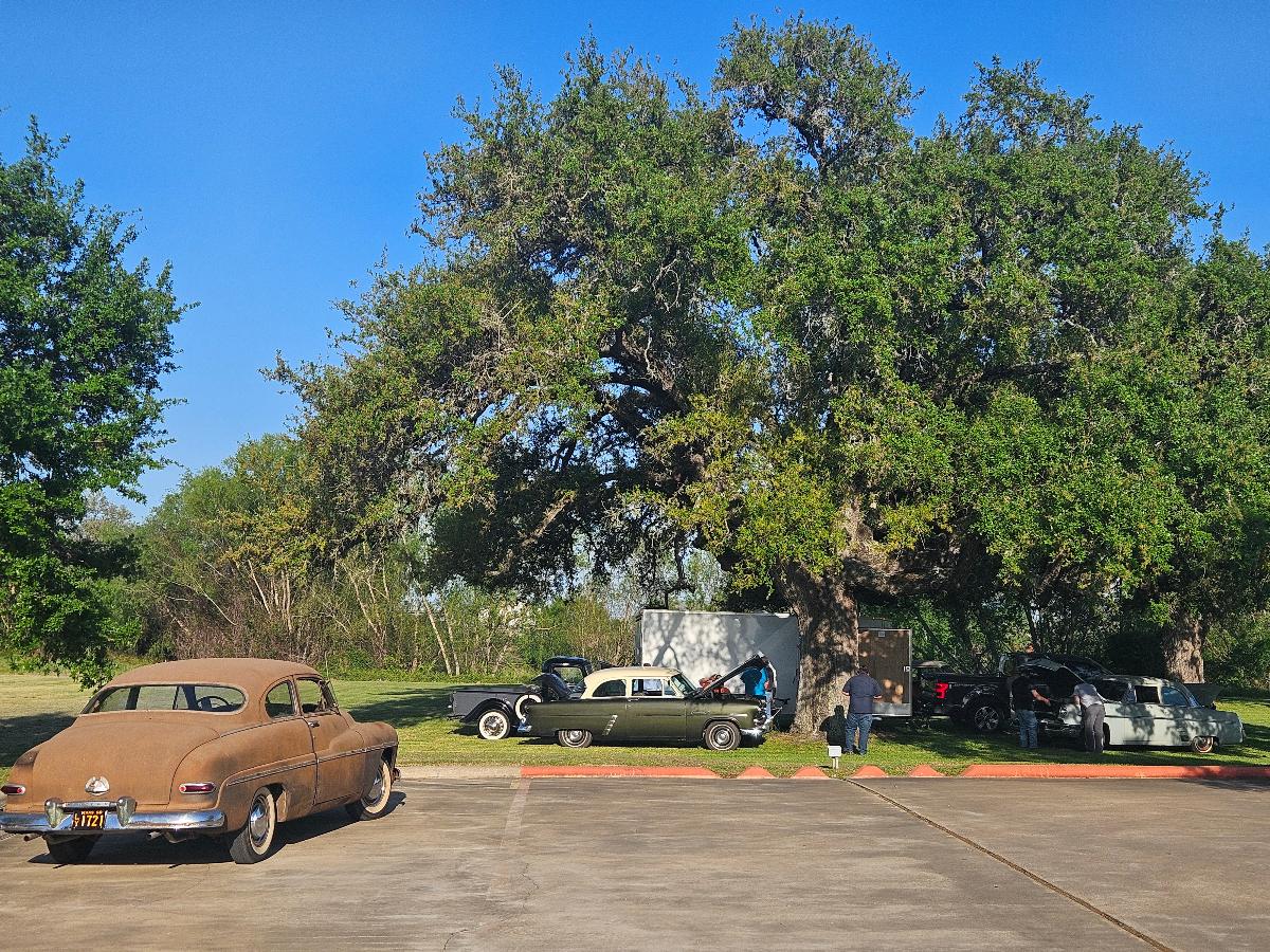 On Thursday we continued our Texas History destinations by touring to Goliad and Cuero. In Goliad we visited several historic destinations. First was a reconstructed mission from the era when Spain was maintaining a claim to the territory west of the Mississippi watershed, including Texas, Mission Espiritu Santo. Next we visited Presidio la Bahía, perhaps the finest example around today of a Spansh frontier fort. This was also the location of the massacre of Texian troops during the war for Texas independence from Mexico. We drove into Goliad to the courthouse square including one of the large live oak trees out front of the courthouse with a historical marker plaque explaining that this tree was used to hang convicted individuals during the era where justice was very swift. On our way back from Goliad we stopped at the Chisholm Trail Museum in Cuero. This museum explains the origin of the Texas cowboy and focuses on the brief but famous period of time of the cattle drives that happened between the USA Civil War and the arrival of railroads in south Texas. Thursday concluded with a couple unplanned technical seminars in the parking lot including replacing the wheel bearing on a 53 Mercury.