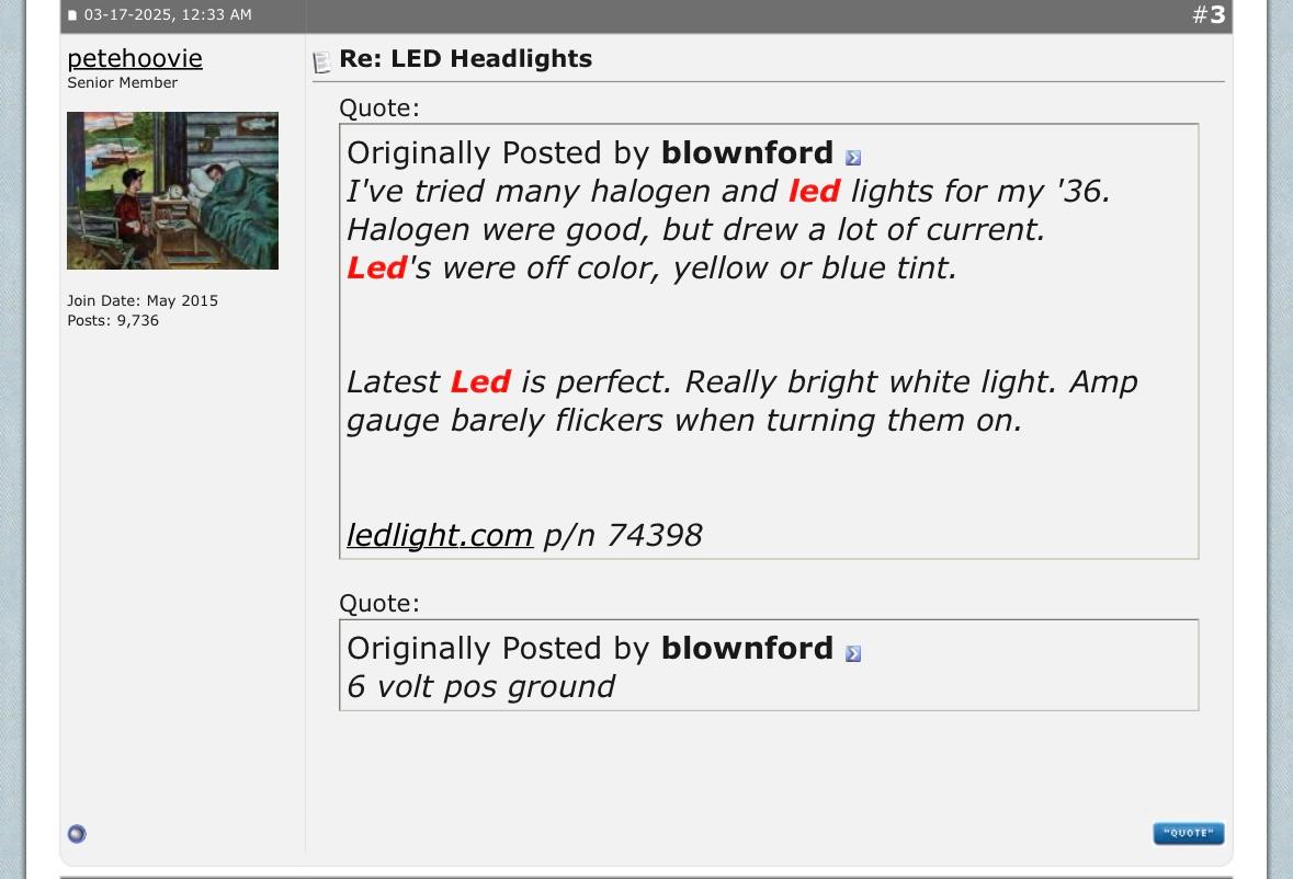 A few years ago, I changed my headlight bulbs to LED in my 36 ford. The LED bulbs install just like the originals with no modifications and they work great. A friend has asked me about them for his car, however, I am unable to find my receipt, or remember where I purchased them, old age thing I guess. Has anyone else tried them that can help me remember? Thank you Frank