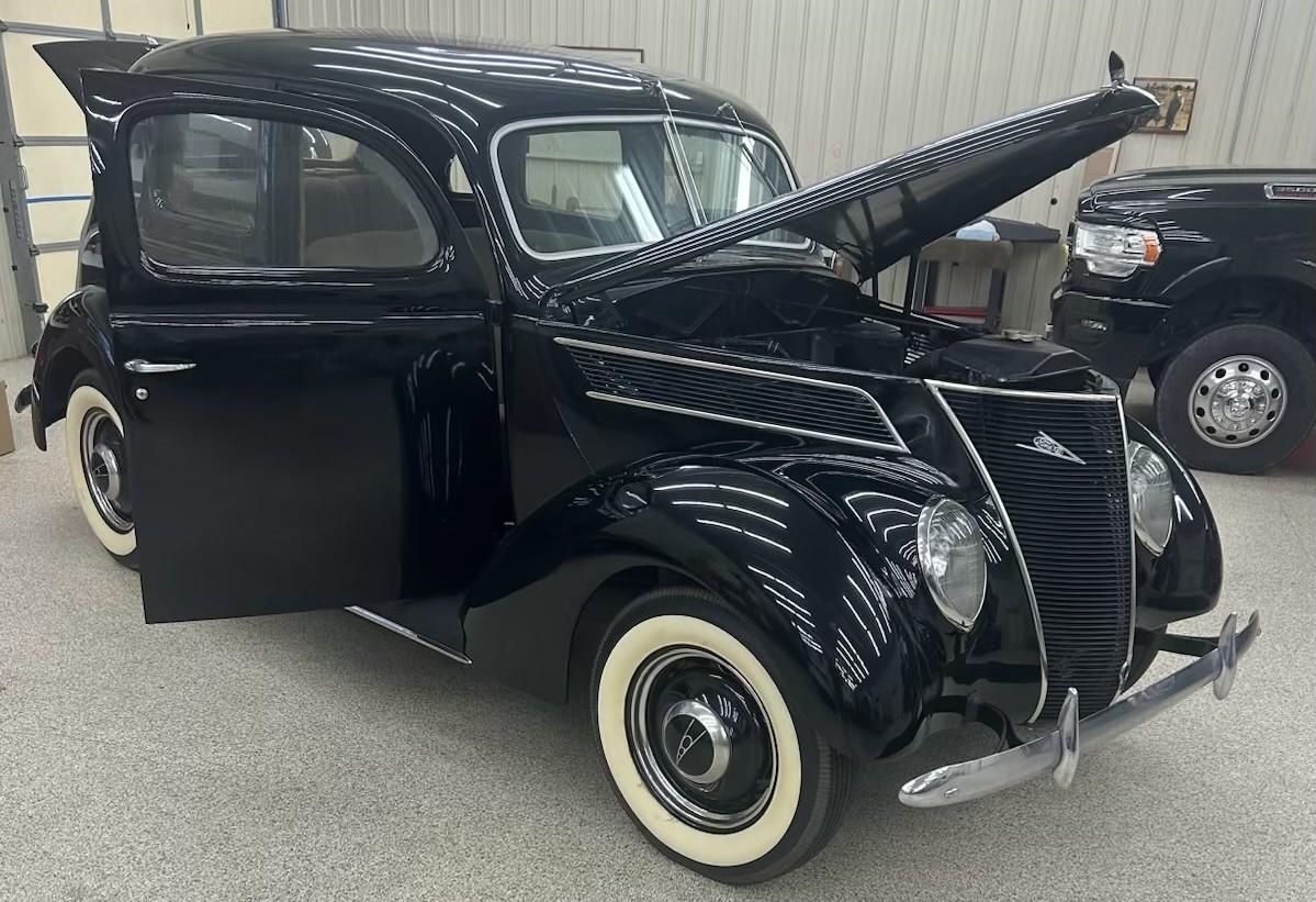 Jadamoon,from the pic you have there looks like a very nice '37 fordor, MG's is correct on the shifter boot my '37 fordor doesn't either. is the new glass installed in the pic? Tom.