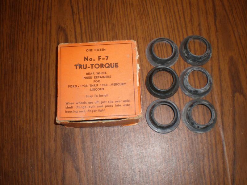 The outer axle seal that Parrish posted a picture of on 5/26, is the aftermarket seal that I have mentioned several times in various posting to the EFV8 Forum. This type of seal was made by many manufactures, one of which was National. The seals purpose was to eliminate the need to completely tare down a rear end to replace the inner axle seals. The seal was especially useful on the Columbia side of a Ford rear end. The design of the seal allowed some gear oil to pass by and into the wheel bearings. I have this type of replacement seals in the rear end of my '36 Ford w/Columbia.. I saved the boxes they came in for many years, eventually the boxes went away.