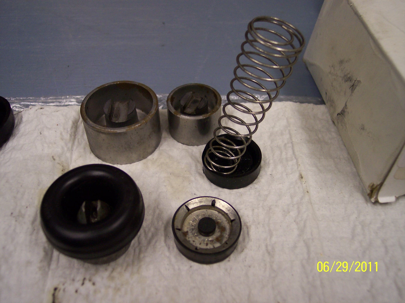 ALL brake parts were new 2 years and 1950 miles ago. Front wheels were still locked up after 6 days of vacation. Removed Dr. Ft. w/c and found the rear shoe was very hard to move @ bottom anchor pin, even after loosening attaching nut. I will check for interference at this point. The internal spring was off center on the rear cup (see photo). The bores of both w/c were as new, as was the master cylinder. I could not see any problem inside the m/c, but will install a new kit, as with the w/c. The USA made w/c had steel pistons. The old w/c had Alum. The old Wagner w/c grove for the brake shoes were 0.180" wide on large bore, and 0.168" on the small bore. The replacement groves were much larger, being 0.312" & 0.230" respectfully. In the photo, the two upper pistons are steel & notice the wide opening for the brake shoes. Bottom left is an original alum. piston. Bottom right is an original cup with a metal insert to prevent what happened to the cup in USA made replacement. There was slight leakage from this cup. You can also see how the spring was off-center when I took unit apart. The brake lining also was pretty well worn. Should I use woven or molded lining to rivet onto my Ford shoes? Rober E.