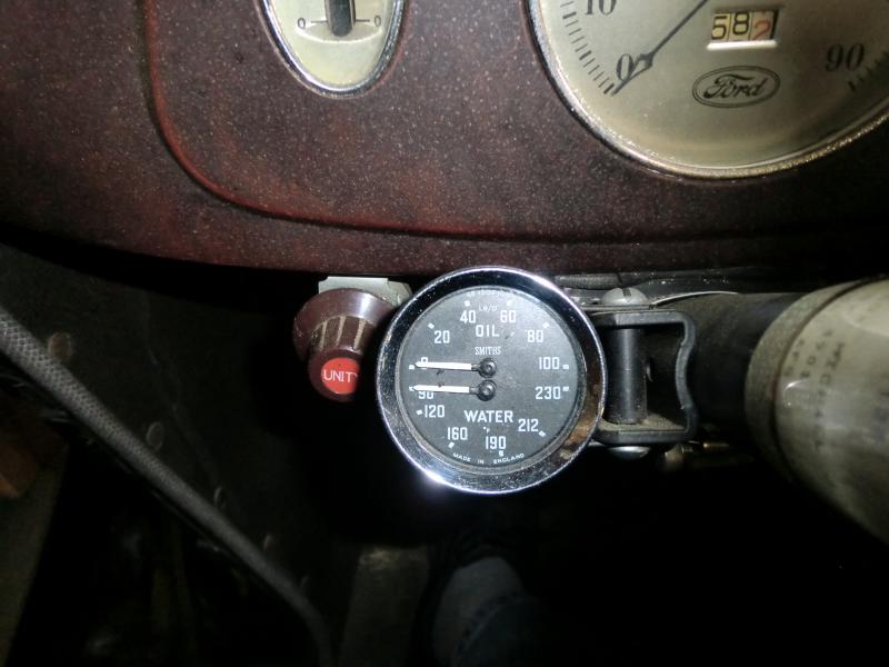 Billc, I had the same problem as you with my '34 Sedan - no factory oil pressure or water temp gauges. I solved this by installing a Smiths Dual Gauge. It's a mechanical gauge made in England and does both jobs in a single gauge housing. I was especially attracted to this gauge given the limited space on the bottom of the dash. I installed it in a standard 2 inch gauge cup and strapped it to my steering column. It connected to the LH water pump and the engine block with no special fittings. See attached photo.