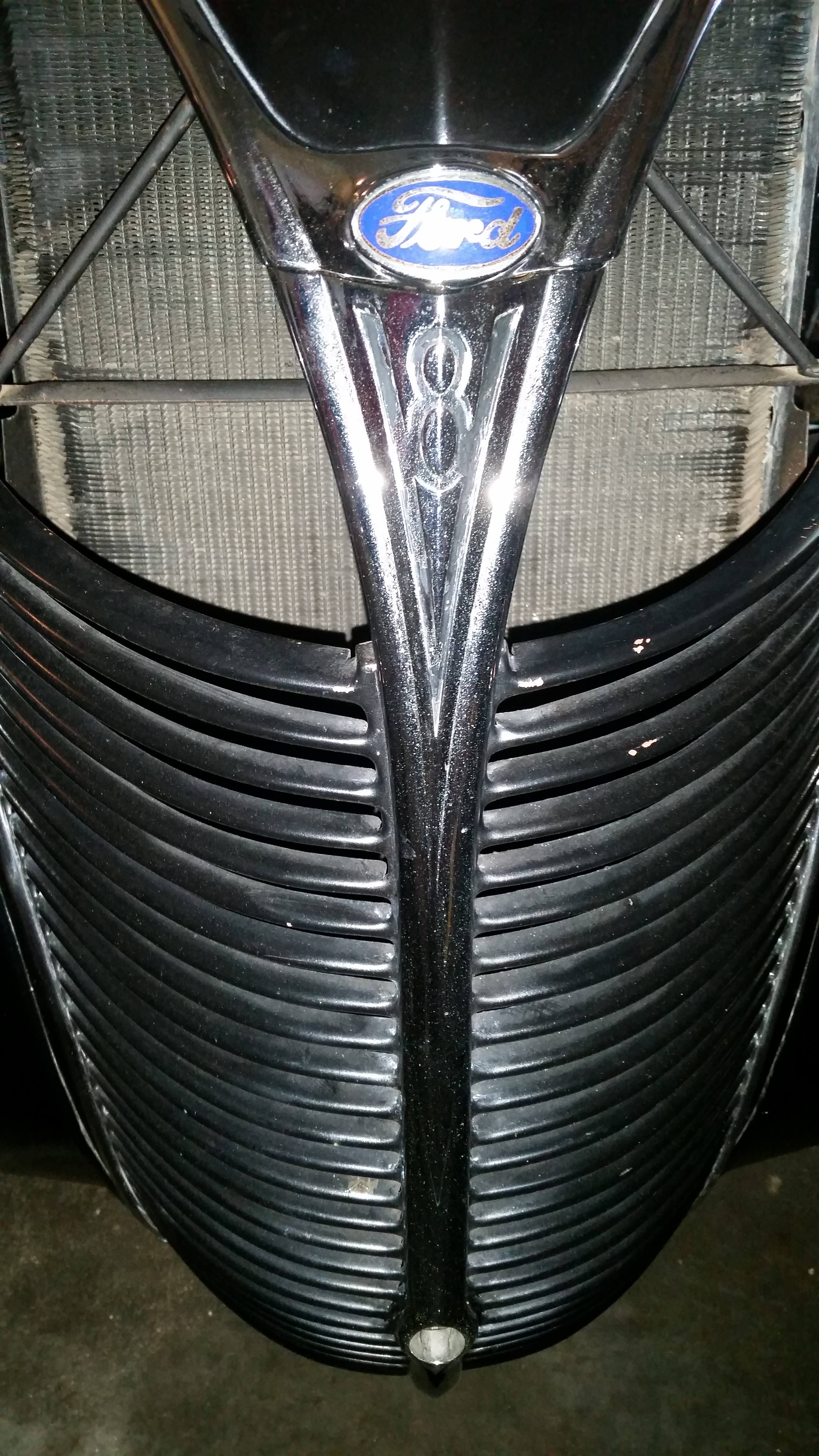 I noticed the V8 logo on my '38 Fordor Deluxe Sedan hubcaps and grille are painted. I believed they were painted using a brush by a previous owner. The paint is wearing off. I'm wanting to keep the car as close to original detail as possible. Was the hubcap V8 symbol paint black, Ford blue or not at all? I've seen pictures of the hubcaps with either black or blue. Searching the web today I believe the V8 symbol was not painted. Which is correct? I could locate no information on the grill V8. I've attached a picture, of the grille, for reference.