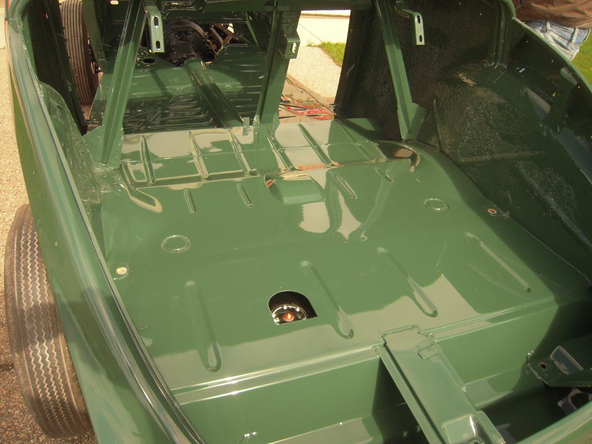 My car apparently got cheated. I find it interesting that they called the color Cloudmist Gray instead of Cloudmist "Green" but I guess that was a marketing decision. Attached are a couple of pictures of the bottom of my car (primer) and a shot of the body inside the left rear fender (Cloudmist Gray). I plan on using acrylic enamel with a hardener to paint the body color. Enamel with a hardener is a great product that is far superior to the original paint. I will probably use POR 15 to do the gloss black frame and suspension unless anyone has a better suggestion.